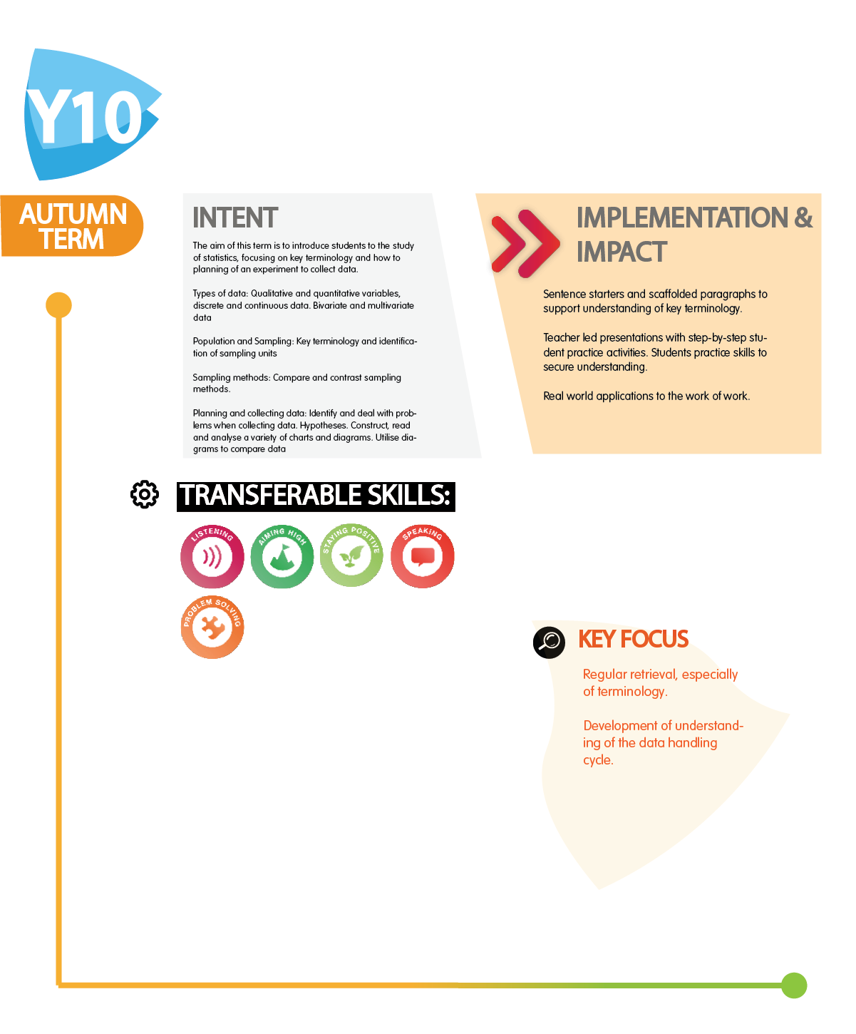A significant key skill within statistics is reading and comprehension. For many students; problem solving or answering multi-part, worded questions is difficult and off-putting. We present students with key terminology as part of starter activities and regularly discuss meanings of key terms and phrases. Written answers when analysing data is a huge element of the statistics course which students are prepared for with regular practice utilising; sentence starters, scaffolded paragraphs and model answers.