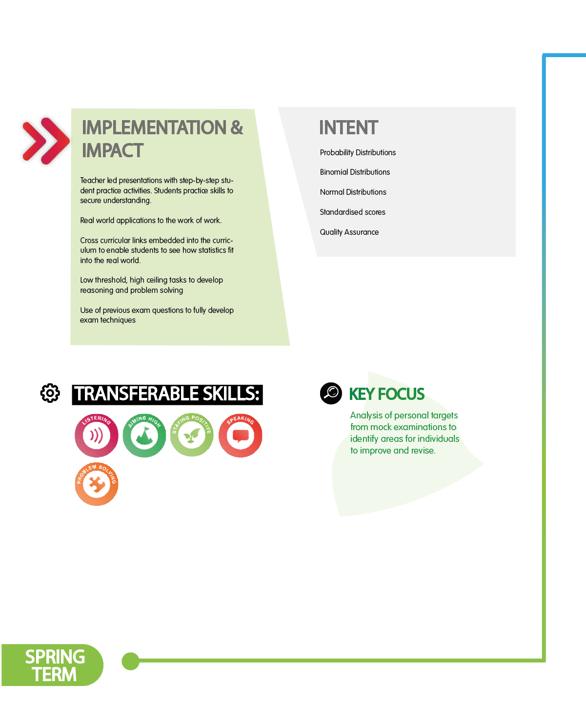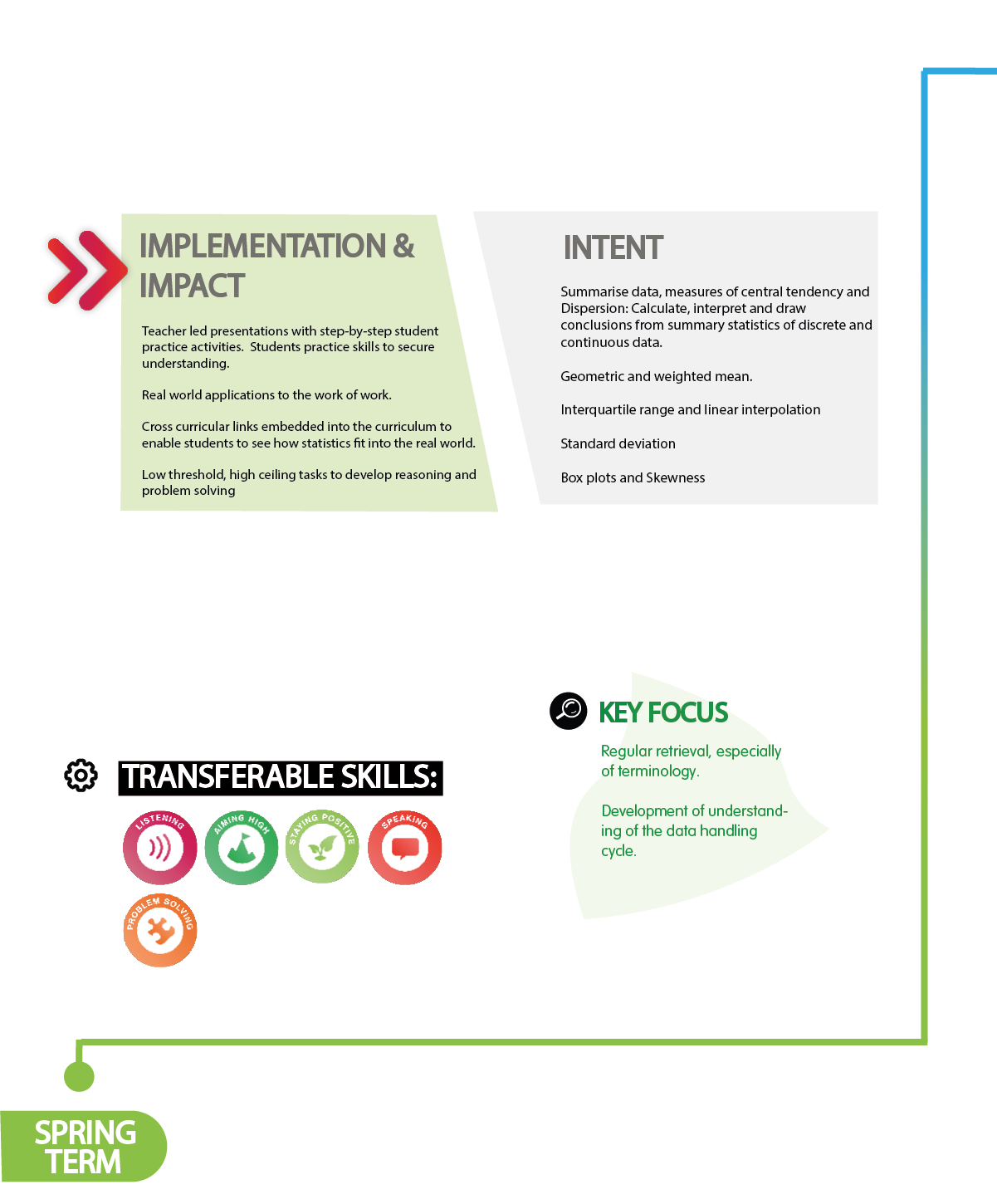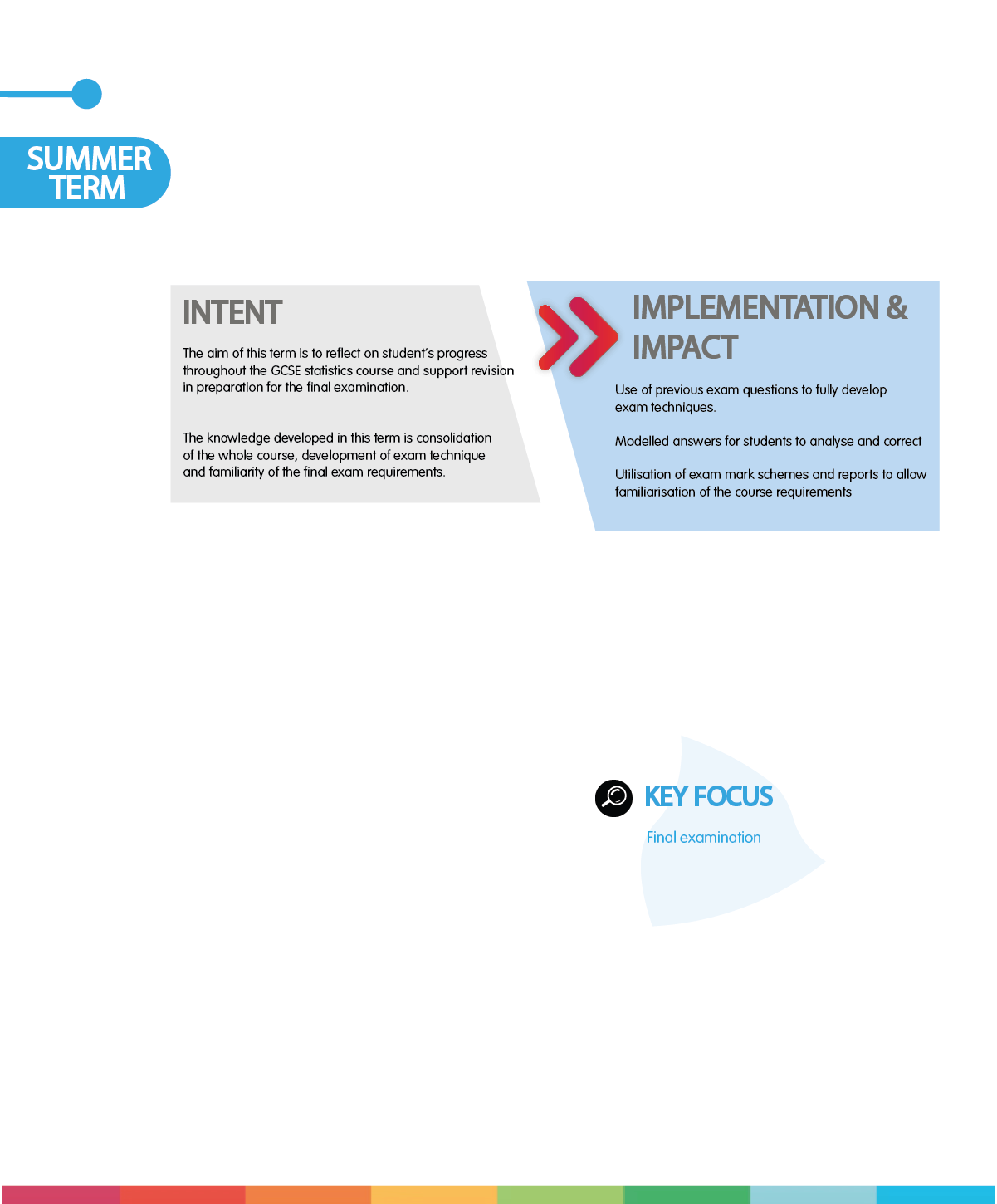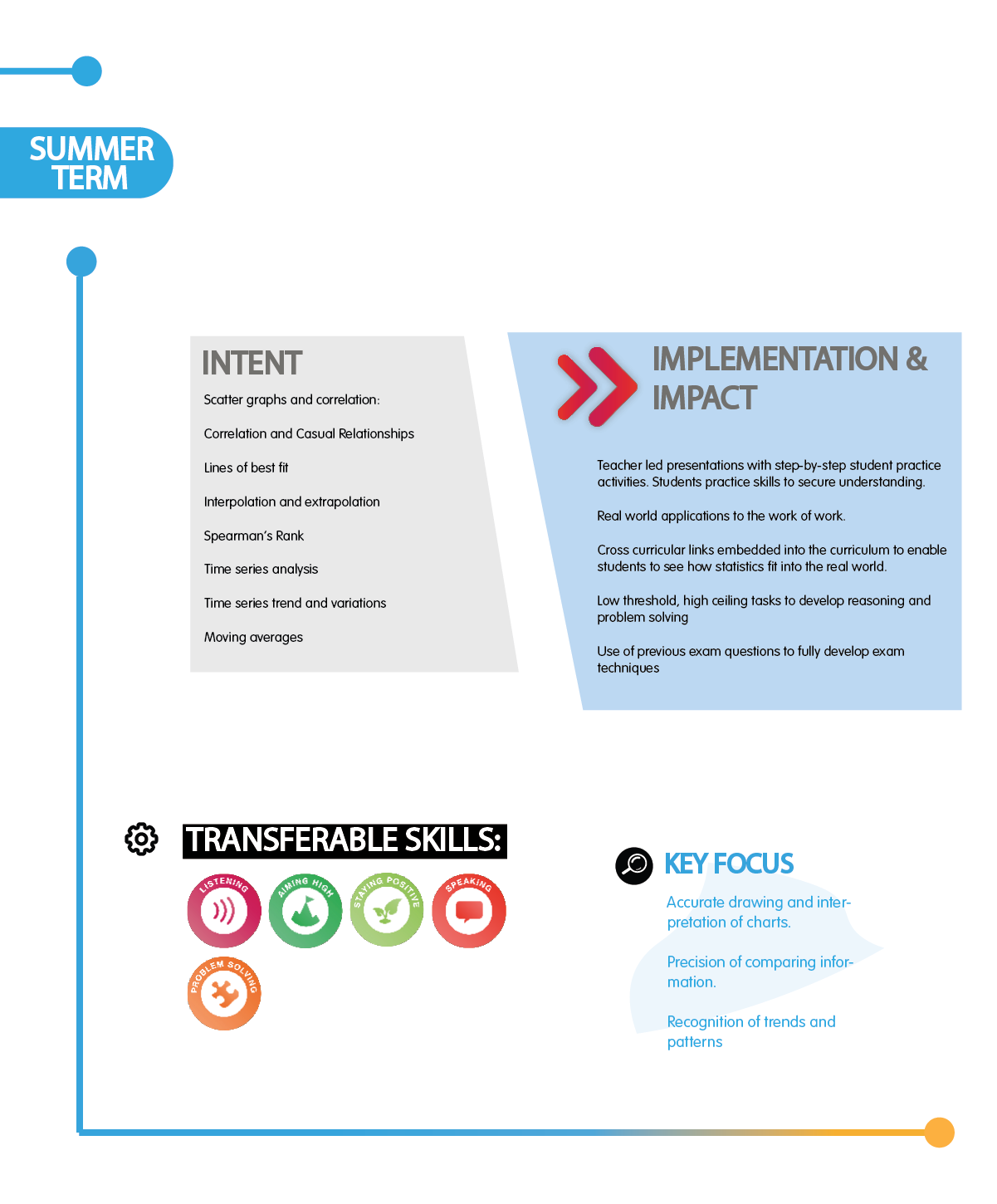 The GCSE statistics course compliments the cultural capital elements of the core mathematics curriculum whilst providing students with knowledge, communication skills and a greater understanding of concepts to allow success in a variety of educational and work settings. Utilising data and information from newspapers, web articles and reports broadens students’ cultural backgrounds. Statistics is a vocationally significant qualification, vital within numerous careers.